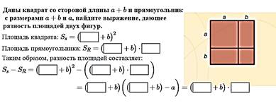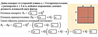 Критерии оценивания: ü Знает формулу площади квадрата и прямоугольника ü Верно выражает площади через заданные переменные ü Верноопределяет общий множитель ü Дает правильный ответ