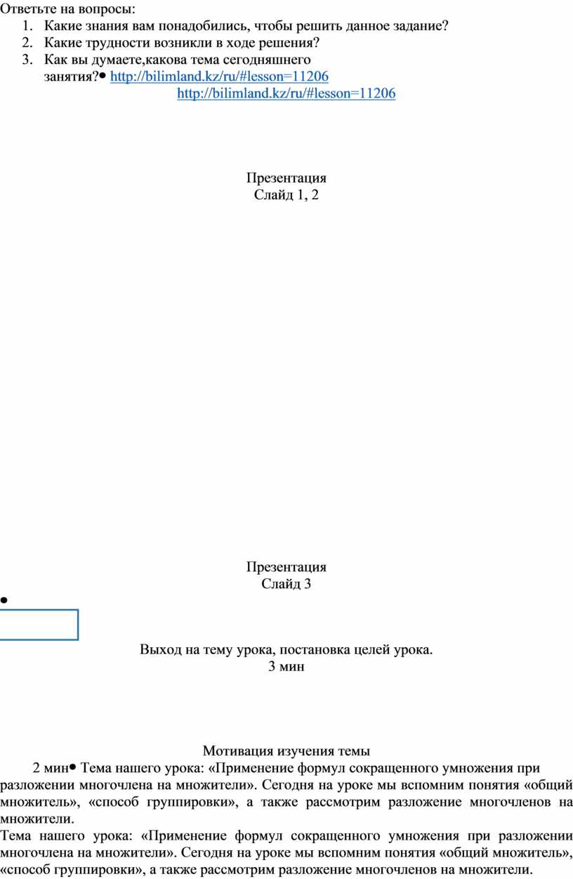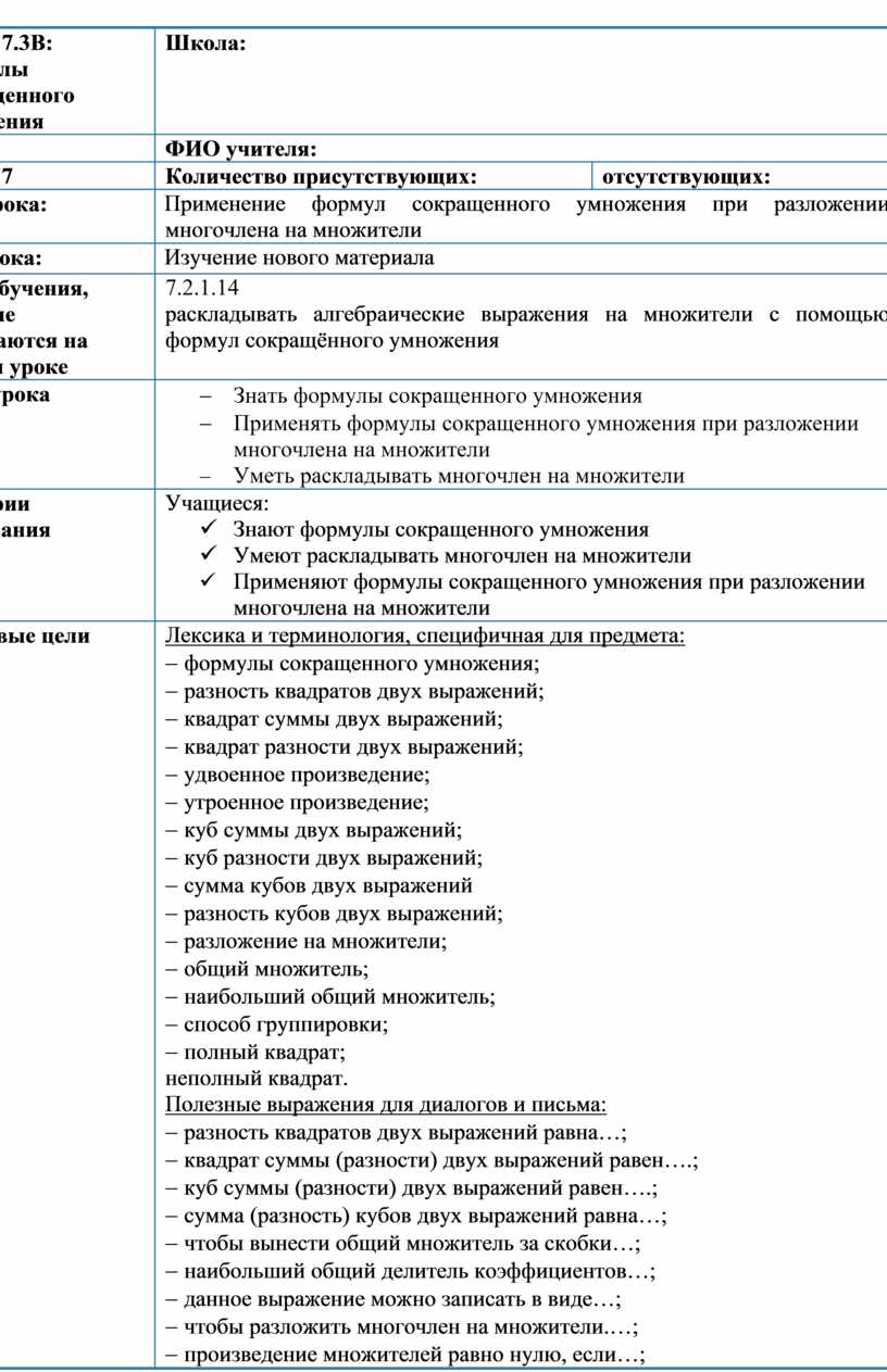 Лексика и терминология, специфичная для предмета: - формулы сокращенного умножения; - разность квадратов двух выражений; - квадрат суммы двух выражений; - квадрат разности двух выражений; - удвоенное произведение; - утроенное произведение; - куб суммы двух выражений; - куб разности двух выражений; - сумма кубов двух выражений - разность кубов двух выражений; - разложение на множители; - общий множитель; - наибольший общий множитель; - способ группировки; - полный квадрат; неполный квадрат. Полезные выражения для диалогов и письма: - разность квадратов двух выражений равна…; - квадрат суммы (разности) двух выражений равен….; - куб суммы (разности) двух выражений равен….; - сумма (разность) кубов двух выражений равна…; - чтобы вынести общий множитель за скобки…; - наибольший общий делитель коэффициентов…; - данное выражение можно записать в виде…; - чтобы разложить многочлен на множители.…; - произведение множителей равно нулю, если…; - сгруппируем члены многочлена (выражения), имеющие …; - чтобы представить данный многочлен в виде произведения, используем …; чтобы в данном выражении выделить квадрат суммы (разности)…. |