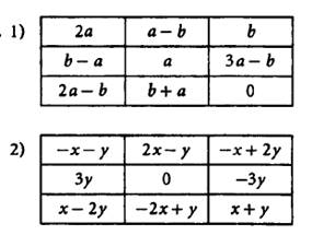 Запишите в клетки каждого квадрата такие выражения, чтобы их сумма в каждом столбце, каждой строке и каждой диагонали была равной «магическому» выражению, записанному в треугольник.