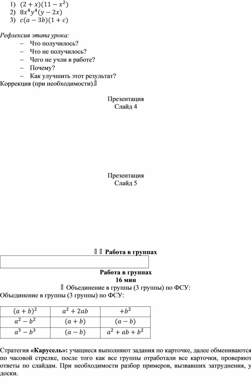 Стратегия «Карусель»: учащиеся выполняют задания по карточке, далее обмениваются по часовой стрелке, после того как все группы отработали все карточки, проверяют ответы по слайдам. При необходимости разбор примеров, вызвавших затруднения, у доски.