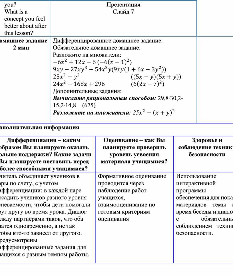 Дифференцированное домашнее задание. Обязательное домашнее задание: Разложите на множители:
