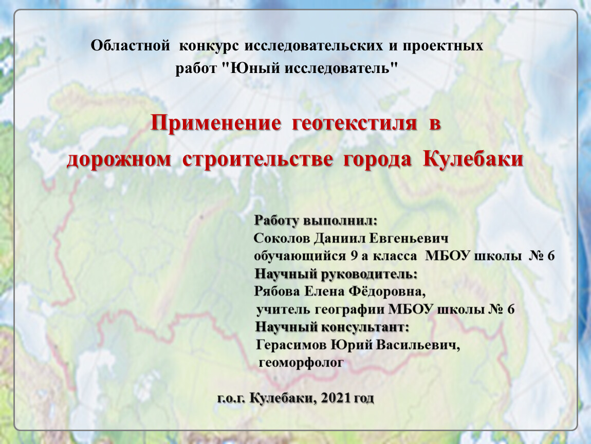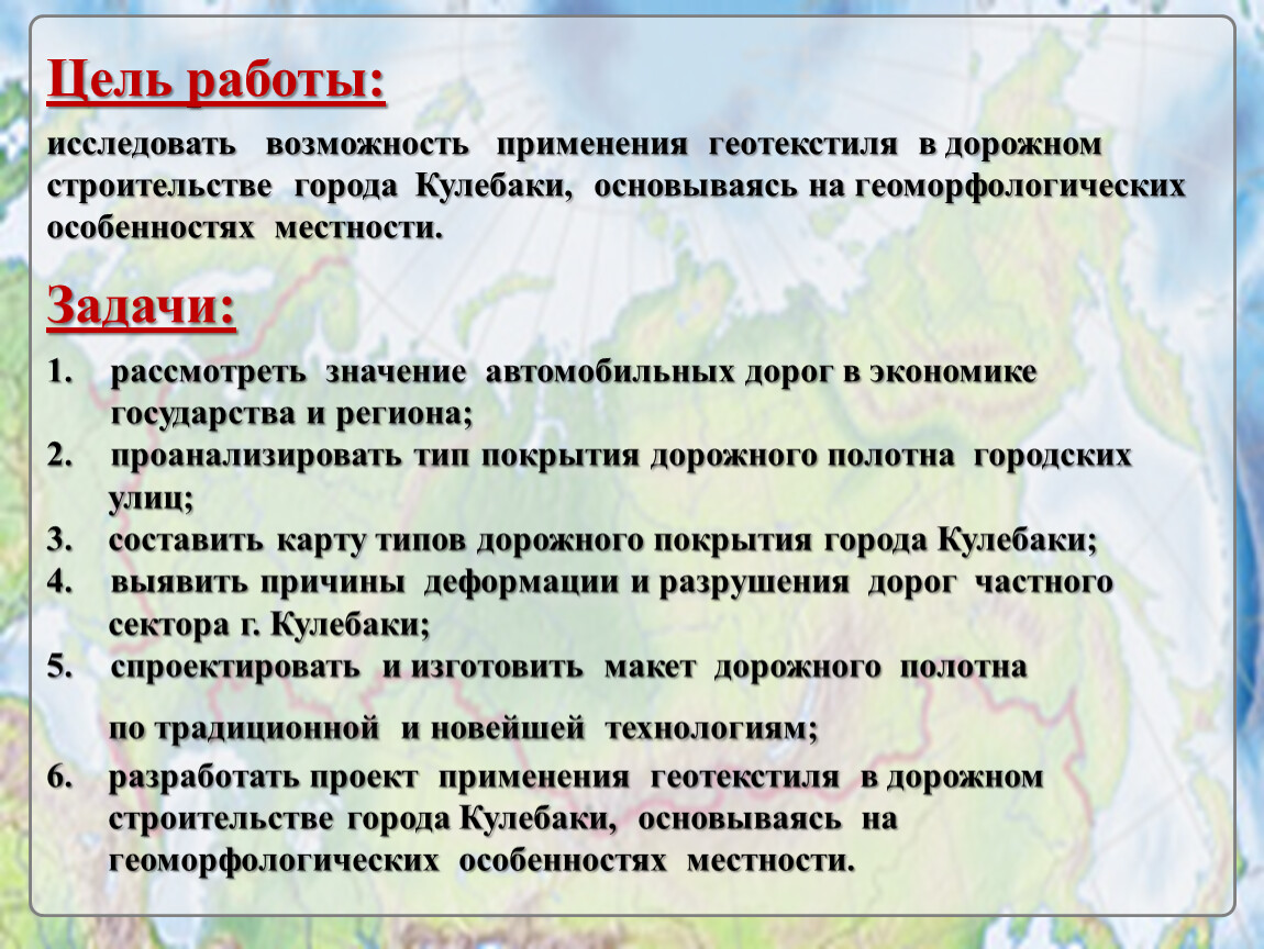 исследовать возможность применения геотекстиля в дорожном строительстве города Кулебаки, основываясь на геоморфологических особенностях местности.