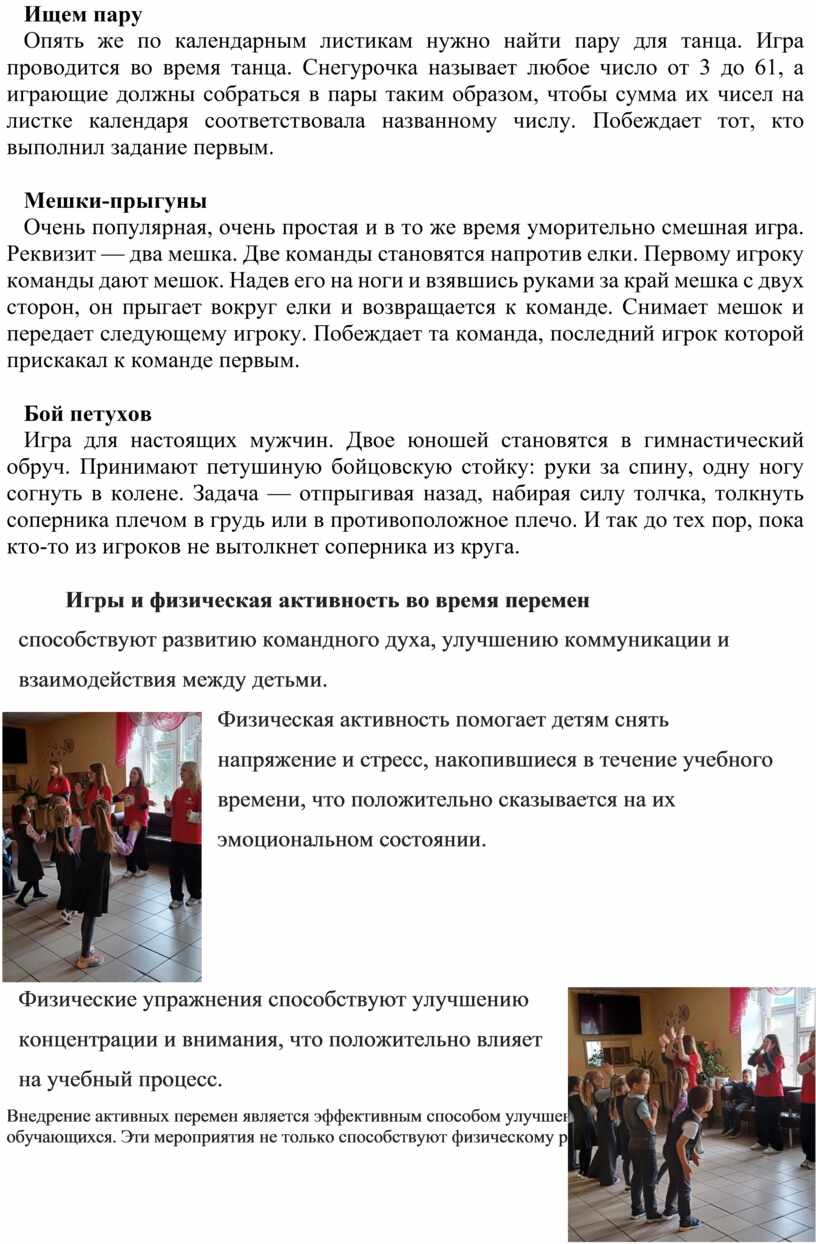 Игры и физическая активность во время перемен