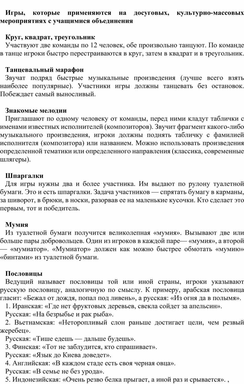 Игры, которые применяются на досуговых, культурно-массовых мероприятиях с учащимися объединения