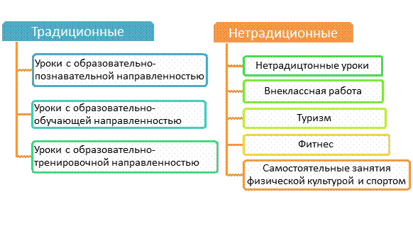 Основными видами нетрадиционных уроков является сюжетно-ролевые игры, уроки здоровья с применением адаптивной гимнастики и фитнес-технологии. На уроках здоровья дети делятся на группы. В группах ослабленных детей следует принципам и нормам предоставления детям таких упражнений, которые способствуют снятию умственного напряжения, исключает длительные статические нагрузки. Использует физические упражнения, которые направлены не только на физическое развитие детей, но и имеющие лечебно-воспитательный эффект, корригирующие, коррекционные упражнения (например, ходьба по лестнице для стоп, шишкам, канату укрепляет и развивает мышцы стопы и предупреждает развитие плоскостопия). Упражнения со скакалкой и обручем содействуют формированию правильной осанки, благотворно действуют на сердечно- сосудистую и дыхательную системы.