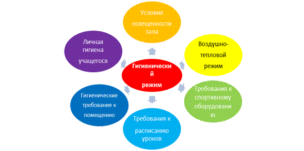 Первое условие оздоровления - это создание на уроках физической культуры гигиенического режима. В обязанности учителя входит умение и готовность видеть и определить явные нарушения требований, предъявляемых к гигиеническим условиям проведения урока и, по возможности изменить их в лучшую сторону - самой, с помощью администрации, медиков.