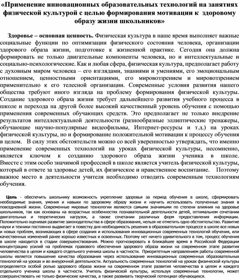 Цель - обеспечить школьнику возможность укрепление здоровья за период обучения в школе, сформировать необходимые знания, умения и навыки по здоровому образу жизни и научить использовать полученные знания в повседневной жизни. Современные мировые технологии являются самыми значимыми по степени влияния на здоровье школьников, так как основаны на возрастных особенностях познавательной деятельности детей, оптимальном сочетании двигательных и теоретических нагрузок, а также сочетании различных форм предоставления информации. Положительно оценивая развитие законодательства в сфере образования, нельзя не отметить одно обстоятельство. Развитие науки и техники постоянно выдвигает в повестку дня необходимость решения в образовательном процессе в школе все новых и новых проблем, возникающих в сфере создания и использования инновационных современных технологий обучения, или качественных изменений ранее хорошо известных и освоенных. Поэтому нет ничего удивительного в том, процесс обучения в школе находится в стадии совершенствования. Можно прогнозировать в ближайшее время в Российской Федерации концентрацию усилий на проблемах правового обеспечения здорового образа жизни на современном этапе развития человечества в целом и каждого отдельного ученика школы в частности. Приоритетным направлением работы современной школы является повышение качества образования через использование инновационных современных образовательных технологий на уроках и во внеурочной деятельности. Актуальность современных технологий на уроках физической культуры определяется особой ролью здорового образа жизни на современном этапе развития человечества в целом и каждого отдельного ученика школы в частности. Учитель физической культуры, используя современные технологии, может совершенствовать не только физические качества, а также развивать творческий потенциал обучающихся.