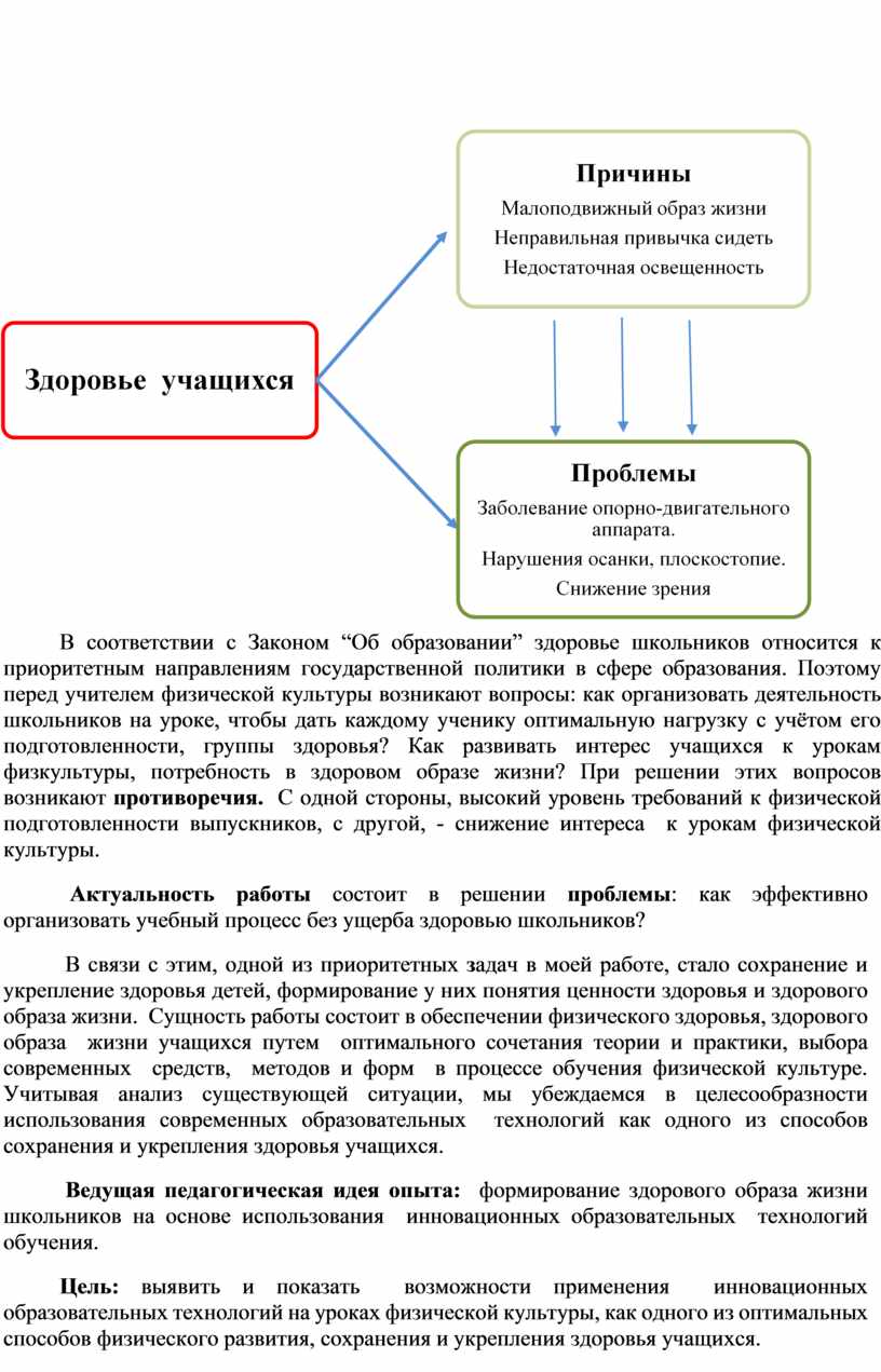 Ведущая педагогическая идея опыта: формирование здорового образа жизни школьников на основе использования инновационных образовательных технологий обучения.