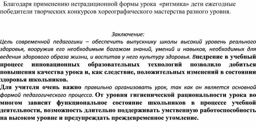 В ходе занятий под музыкальное сопровождение можно менять темп упражнений и повышать их интенсивность. Танцевально-ритмическая гимнастика, различные виды аэробики, элементы ритмики находят отражение в той или иной направленности уроков физической культуры: легкоатлетической, гимнастической, игровой и т.д., они способствуют разнообразию используемых средств в подготовительной, основной и заключительной частей урока. Также уроки ритмики могу являться отдельным предметом в школе, и нести в себе не только физическое, но и нравственно- эстетическое, с точки зрения культуры хореографии, совершенствование школьников на всех этапах обучения в школе.