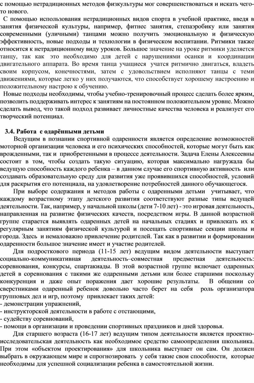 При выборе содержания и методов работы с одаренными детьми учитывает, что каждому возрастному этапу детского развития соответствуют разные типы ведущей деятельности. Так, например, у начальной школы (дети 7-10 лет) - это игровая деятельность, направленная на развитие физических качеств, посредством игры. В данной возрастной группе старается выявлять одаренных детей на начальных стадиях и привлекать их к регулярным занятиям физической культурой и посещать спортивные секции школы и города. Здесь и немаловажно привлечение родителей. Так как в развитии и формировании одаренности большое значение имеет и участие родителей.