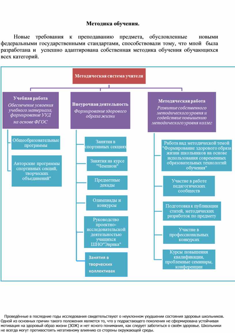 Новые требования к преподаванию предмета, обусловленные новыми федеральными государственными стандартами, способствовали тому, что мпой была разработана и успешно адаптирована собственная методика обучения обучающихся всех категорий.