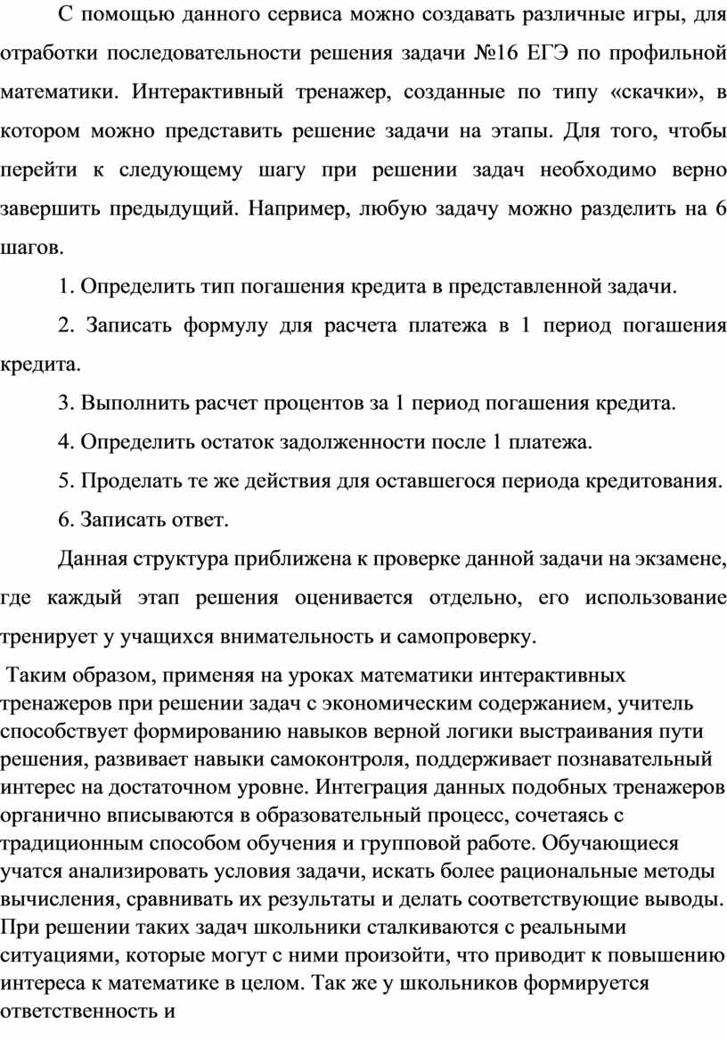 С помощью данного сервиса можно создавать различные игры, для отработки последовательности решения задачи №16 ЕГЭ по профильной математики. Интерактивный тренажер, созданные по типу «скачки», в котором можно представить решение задачи на этапы. Для того, чтобы перейти к следующему шагу при решении задач необходимо верно завершить предыдущий. Например, любую задачу можно разделить на 6 шагов.