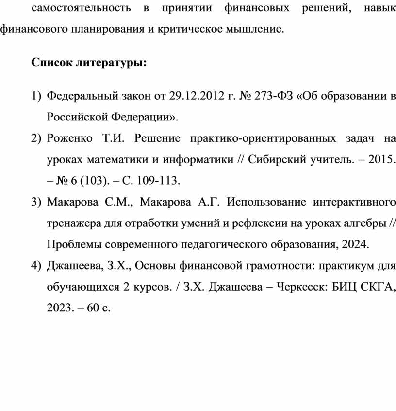 4) Джашеева, З.Х., Основы финансовой грамотности: практикум для обучающихся 2 курсов. / З.Х. Джашеева – Черкесск: БИЦ СКГА, 2023. – 60 с.