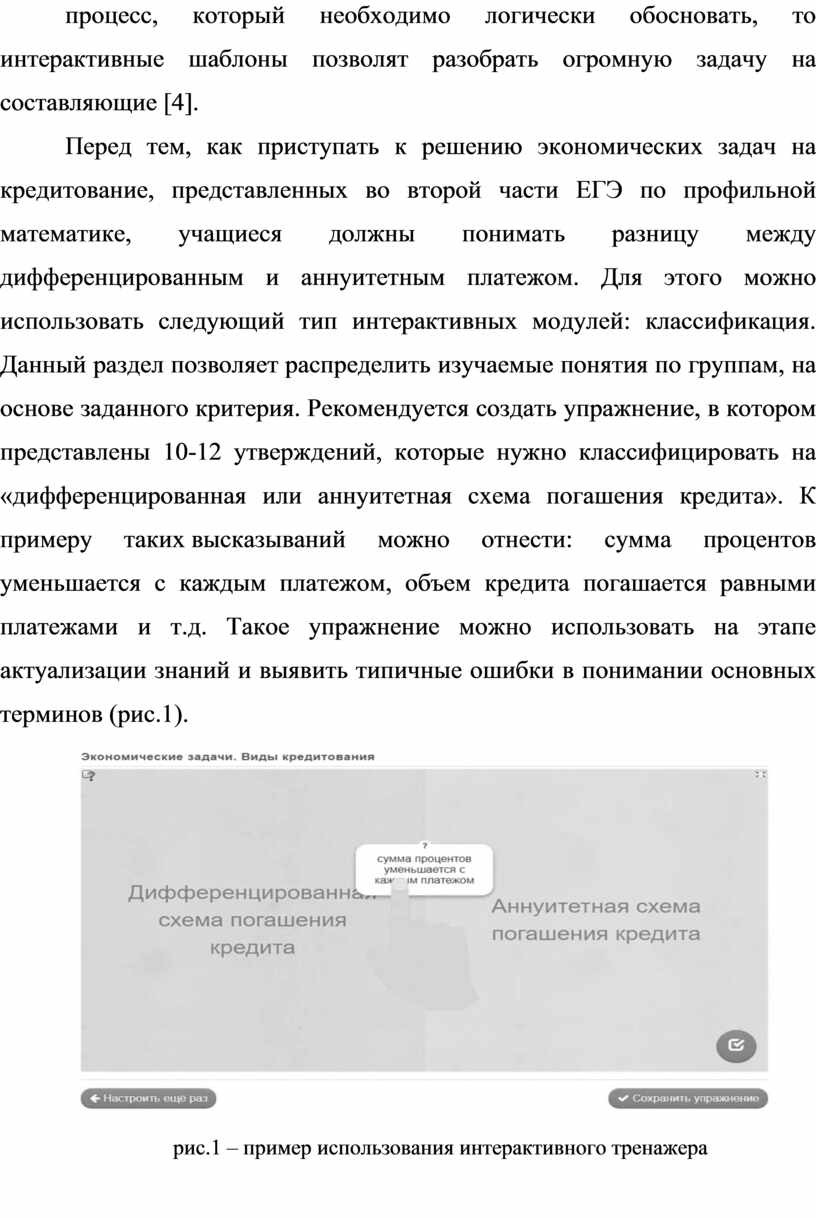 Перед тем, как приступать к решению экономических задач на кредитование, представленных во второй части ЕГЭ по профильной математике, учащиеся должны понимать разницу между дифференцированным и аннуитетным платежом. Для этого можно использовать следующий тип интерактивных модулей: классификация. Данный раздел позволяет распределить изучаемые понятия по группам, на основе заданного критерия. Рекомендуется создать упражнение, в котором представлены 10-12 утверждений, которые нужно классифицировать на «дифференцированная или аннуитетная схема погашения кредита». К примеру таких высказываний можно отнести: сумма процентов уменьшается с каждым платежом, объем кредита погашается равными платежами и т.д. Такое упражнение можно использовать на этапе актуализации знаний и выявить типичные ошибки в понимании основных терминов (рис.1).