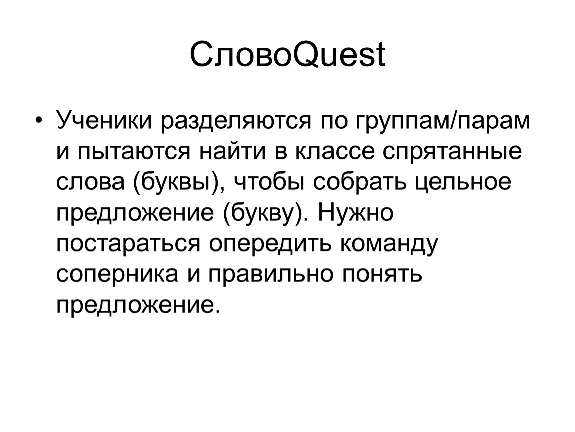 Ученики разделяются по группам/парам и пытаются найти в классе спрятанные слова (буквы), чтобы собрать цельное предложение (букву). Нужно постараться опередить команду соперника и правильно понять предложение.