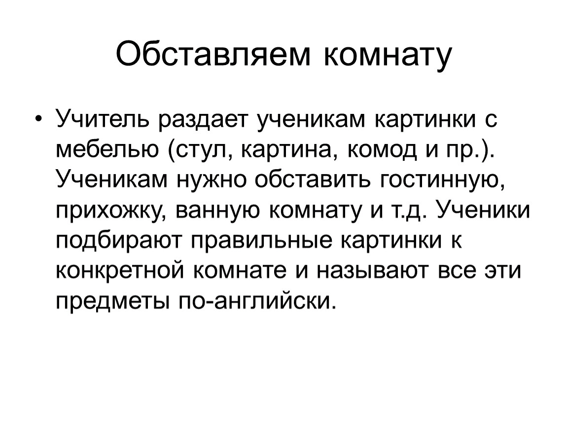 Учитель раздает ученикам картинки с мебелью (стул, картина, комод и пр.). Ученикам нужно обставить гостинную, прихожку, ванную комнату и т.д. Ученики подбирают правильные картинки к конкретной комнате и называют все эти предметы по-английски.
