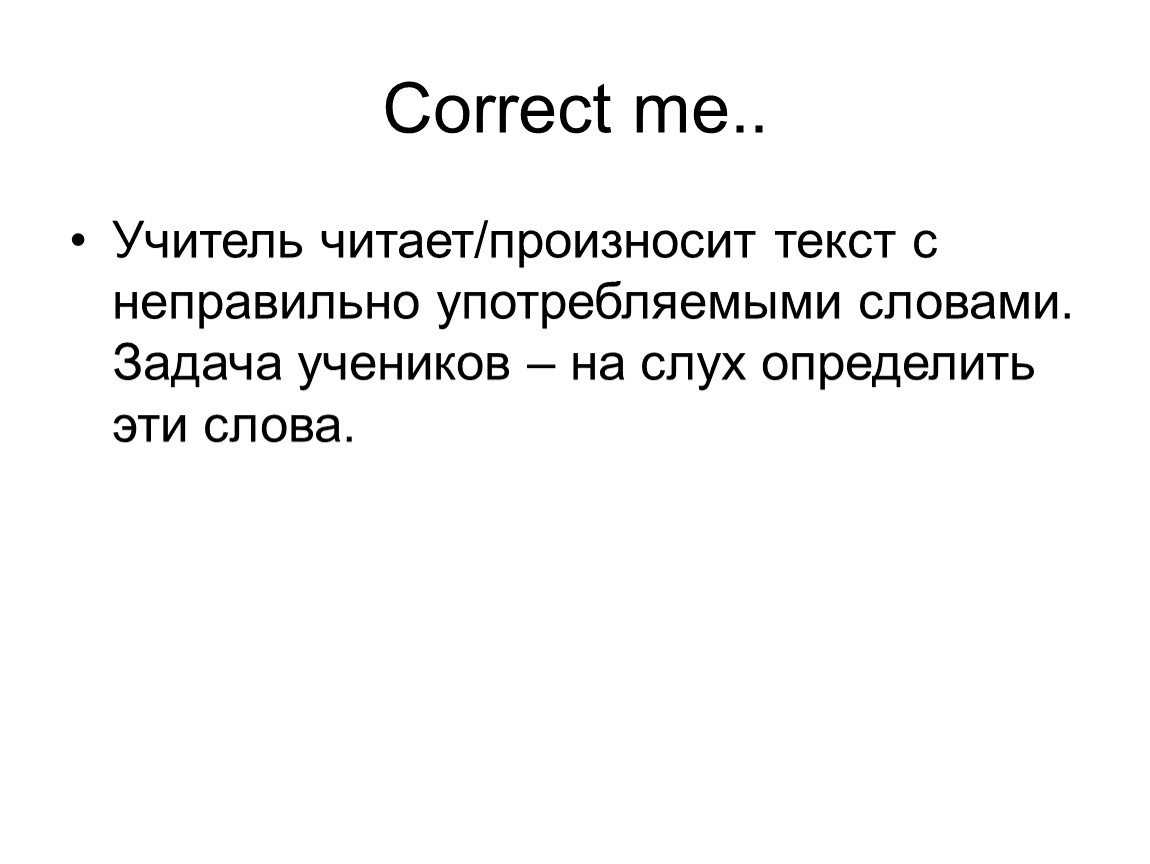 Учитель читает/произносит текст с неправильно употребляемыми словами. Задача учеников – на слух определить эти слова.