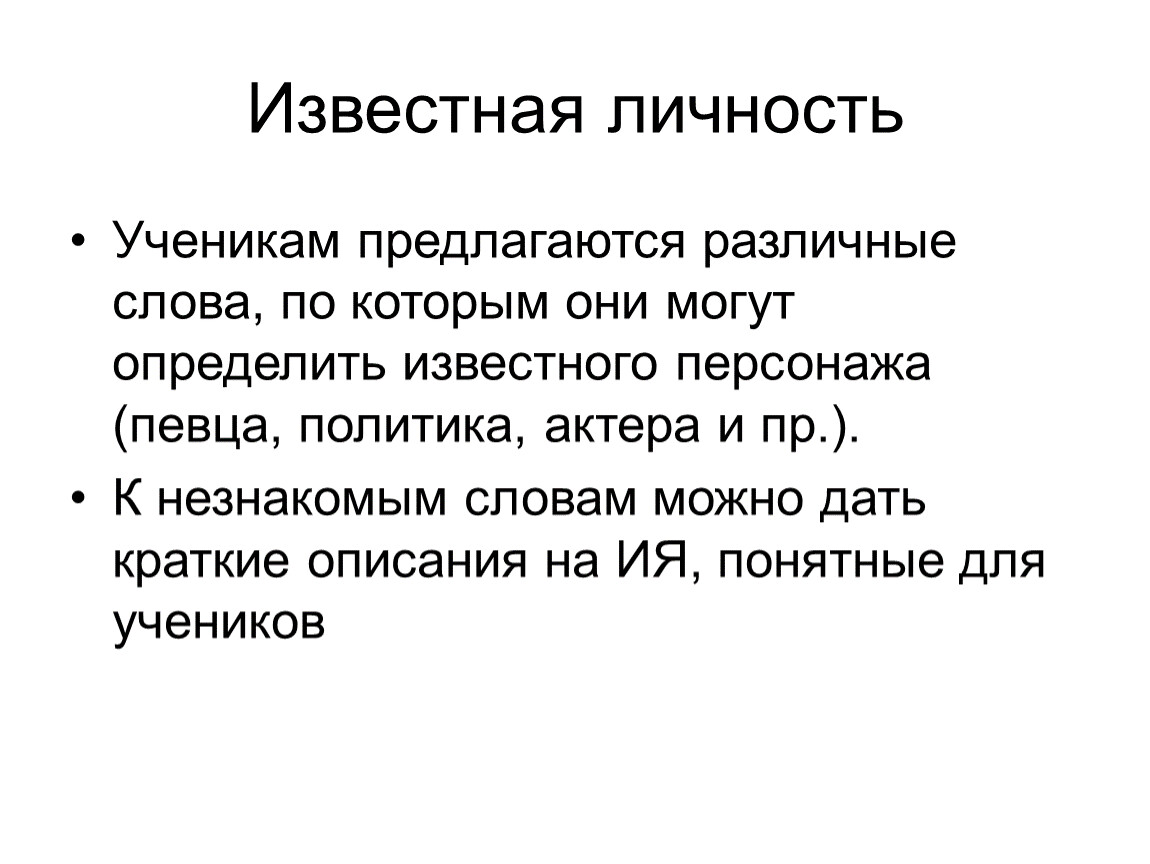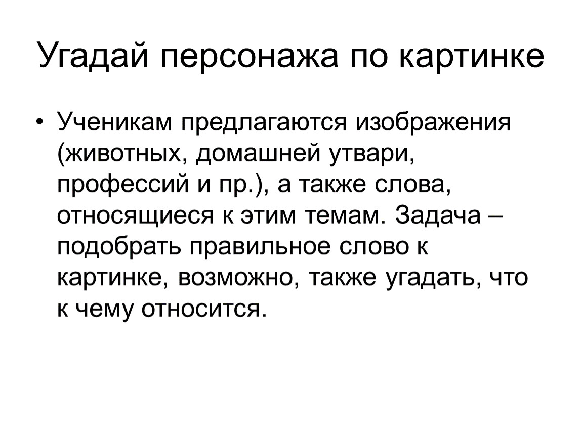 Ученикам предлагаются изображения (животных, домашней утвари, профессий и пр.), а также слова, относящиеся к этим темам. Задача – подобрать правильное слово к картинке, возможно, также угадать, что к чему относится.