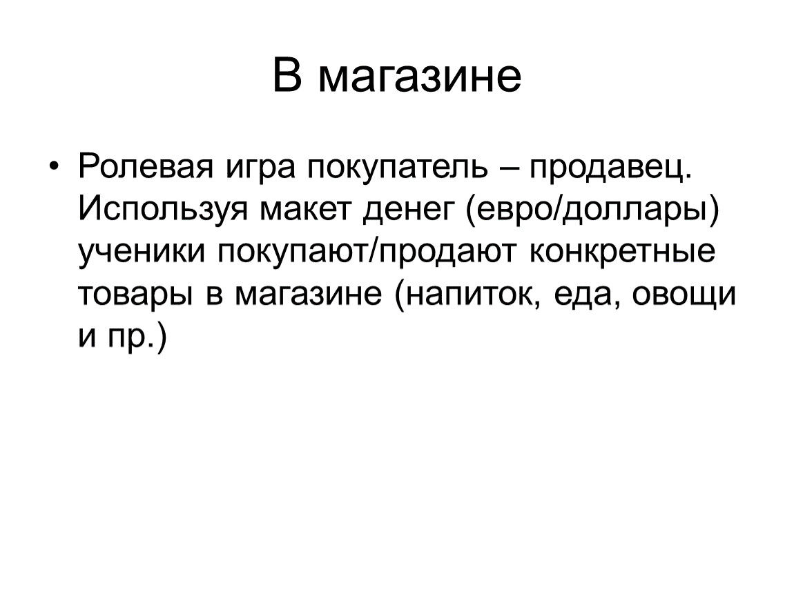 Ролевая игра покупатель – продавец. Используя макет денег (евро/доллары) ученики покупают/продают конкретные товары в магазине (напиток, еда, овощи и пр.)