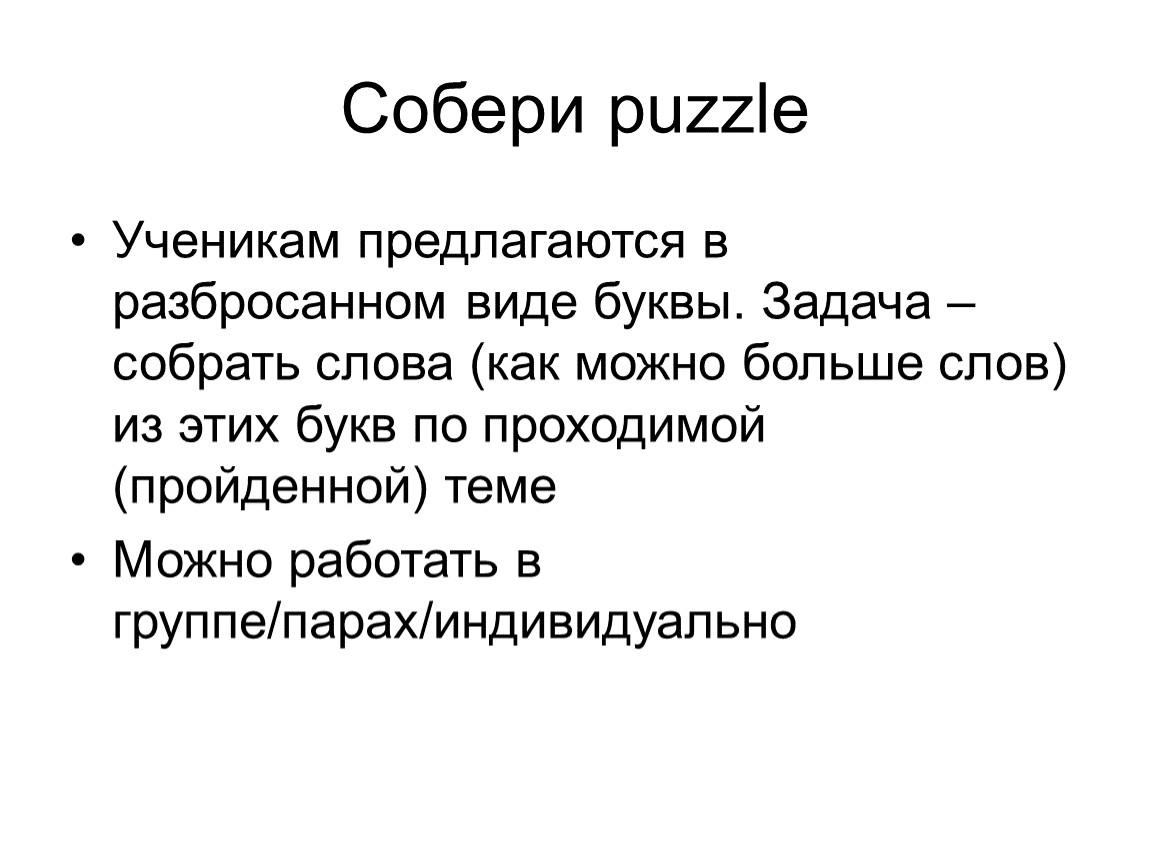 Ученикам предлагаются в разбросанном виде буквы. Задача – собрать слова (как можно больше слов) из этих букв по проходимой (пройденной) теме