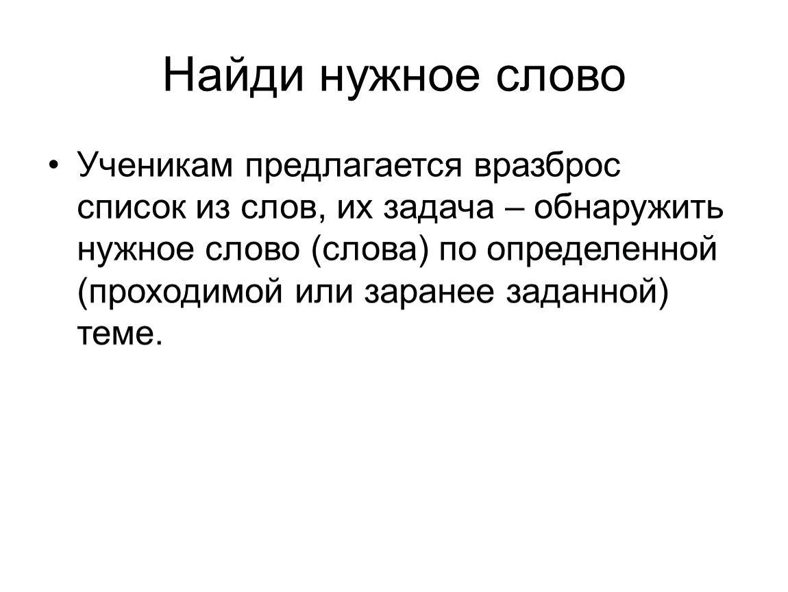 Ученикам предлагается вразброс список из слов, их задача – обнаружить нужное слово (слова) по определенной (проходимой или заранее заданной) теме.