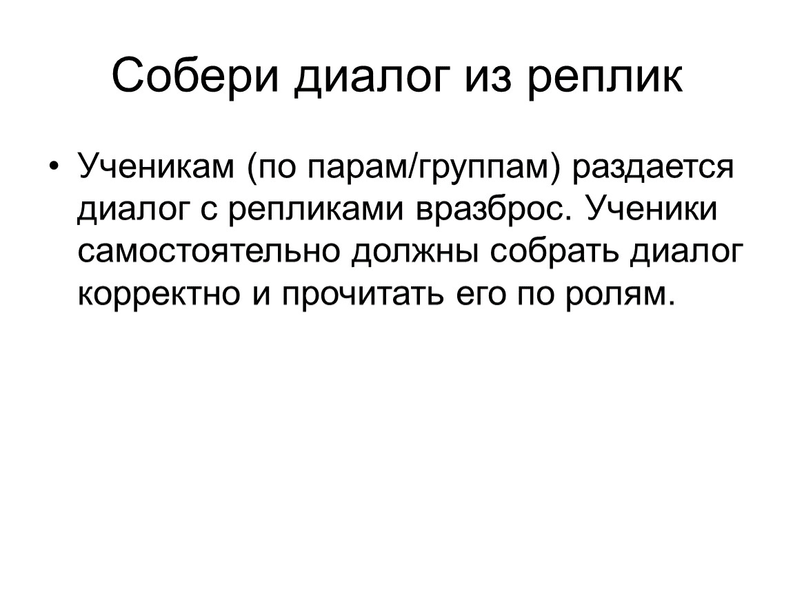 Ученикам (по парам/группам) раздается диалог с репликами вразброс. Ученики самостоятельно должны собрать диалог корректно и прочитать его по ролям.