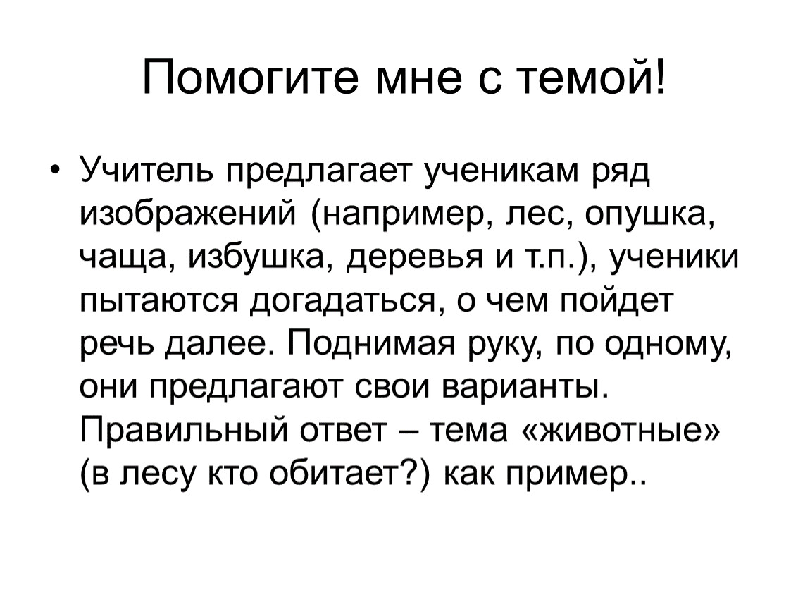Учитель предлагает ученикам ряд изображений (например, лес, опушка, чаща, избушка, деревья и т.п.), ученики пытаются догадаться, о чем пойдет речь далее. Поднимая руку, по одному, они предлагают свои варианты. Правильный ответ – тема «животные» (в лесу кто обитает?) как пример..