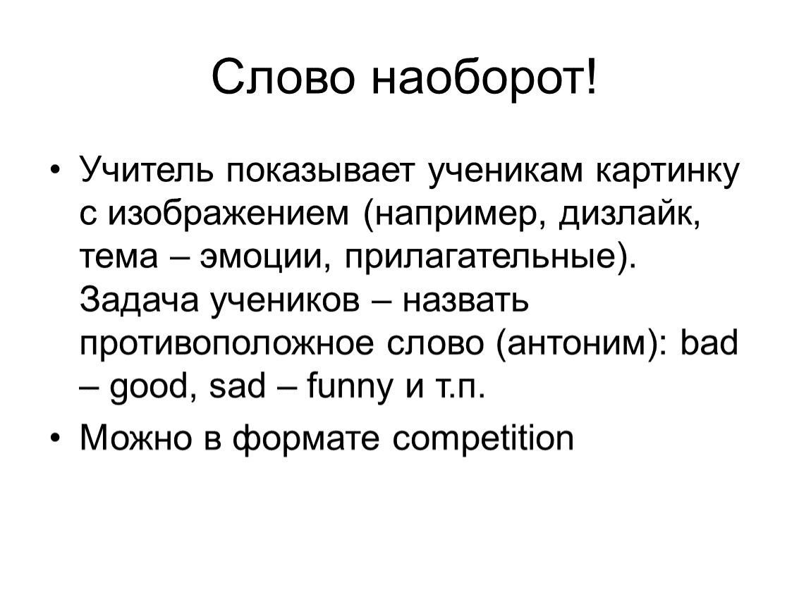 Учитель показывает ученикам картинку с изображением (например, дизлайк, тема – эмоции, прилагательные). Задача учеников – назвать противоположное слово (антоним): bad – good, sad – funny и т.п.