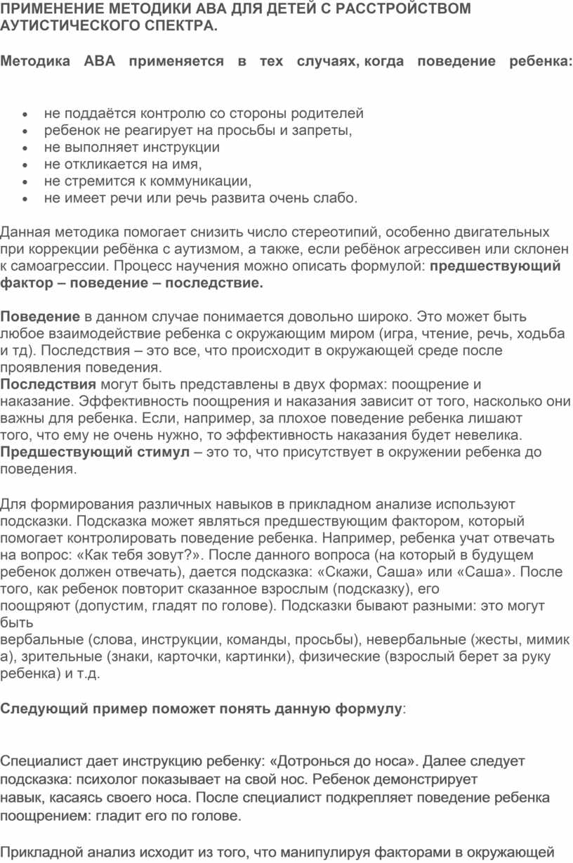 ПРИМЕНЕНИЕ МЕТОДИКИ АВА ДЛЯ ДЕТЕЙ С РАССТРОЙСТВОМ АУТИСТИЧЕСКОГО СПЕКТРА.