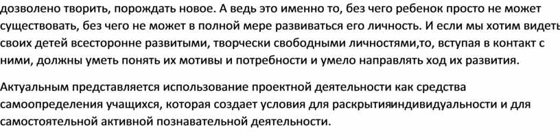 Актуальным представляется использование проектной деятельности как средства самоопределения учащихся, которая создает условия для раскрытия индивидуальности и для самостоятельной активной познавательной деятельности.