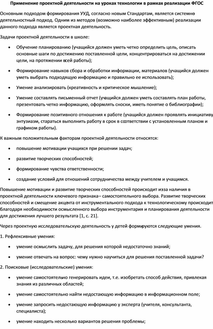 Применение проектной деятельности на уроках технологии в рамках реализации ФГОС