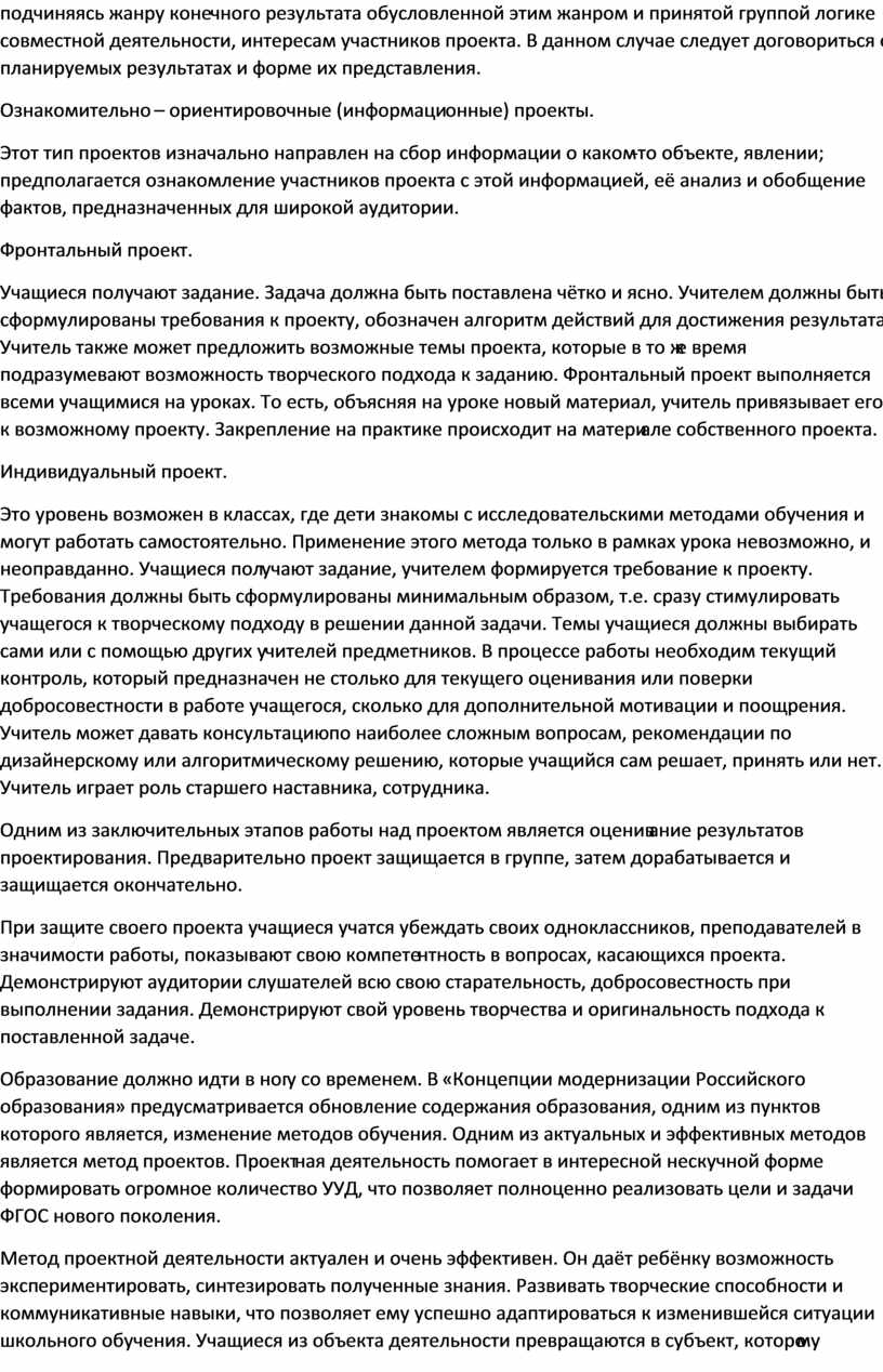Образование должно идти в ногу со временем. В «Концепции модернизации Российского образования» предусматривается обновление содержания образования, одним из пунктов которого является, изменение методов обучения. Одним из актуальных и эффективных методов является метод проектов. Проектная деятельность помогает в интересной нескучной форме формировать огромное количество УУД, что позволяет полноценно реализовать цели и задачи ФГОС нового поколения.