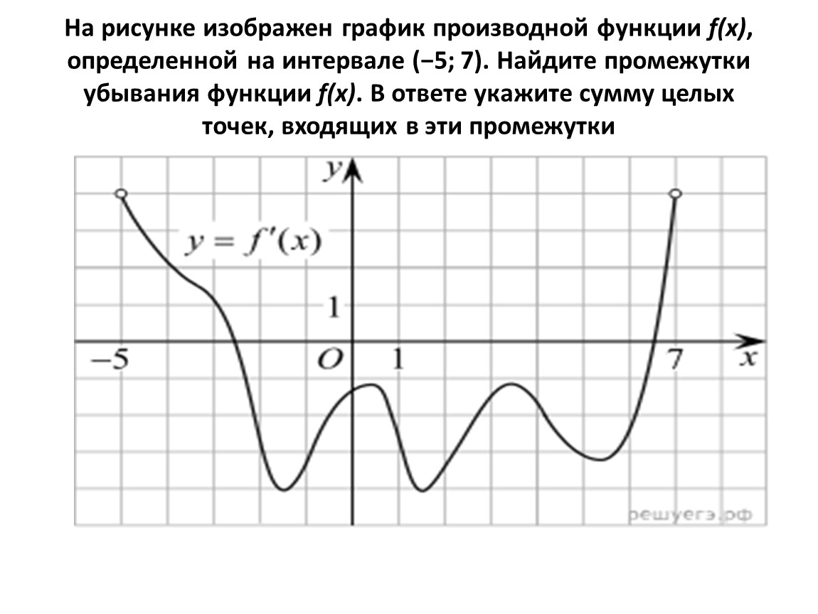 На рисунке изображен график производной функции f(x), определенной на интервале (−5; 7). Найдите промежутки убывания функции f(x). В ответе укажите сумму целых точек, входящих в эти промежутки