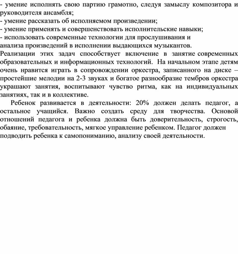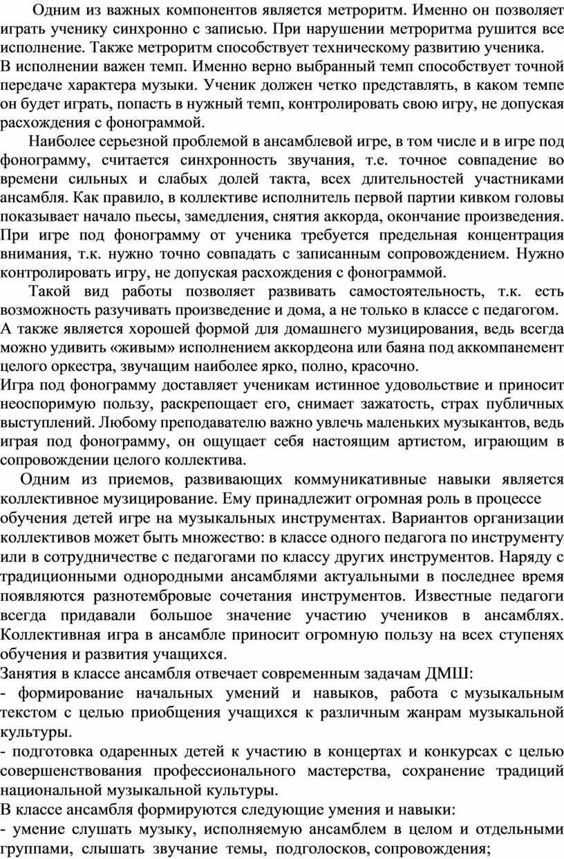 обучения детей игре на музыкальных инструментах. Вариантов организации коллективов может быть множество: в классе одного педагога по инструменту или в сотрудничестве с педагогами по классу других инструментов. Наряду с традиционными однородными ансамблями актуальными в последнее время появляются разнотембровые сочетания инструментов. Известные педагоги всегда придавали большое значение участию учеников в ансамблях. Коллективная игра в ансамбле приносит огромную пользу на всех ступенях обучения и развития учащихся.