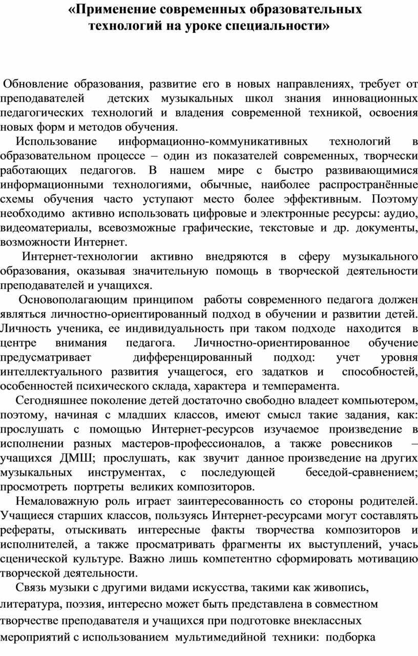 Обновление образования, развитие его в новых направлениях, требует от преподавателей детских музыкальных школ знания инновационных педагогических технологий и владения современной техникой, освоения новых форм и методов обучения.