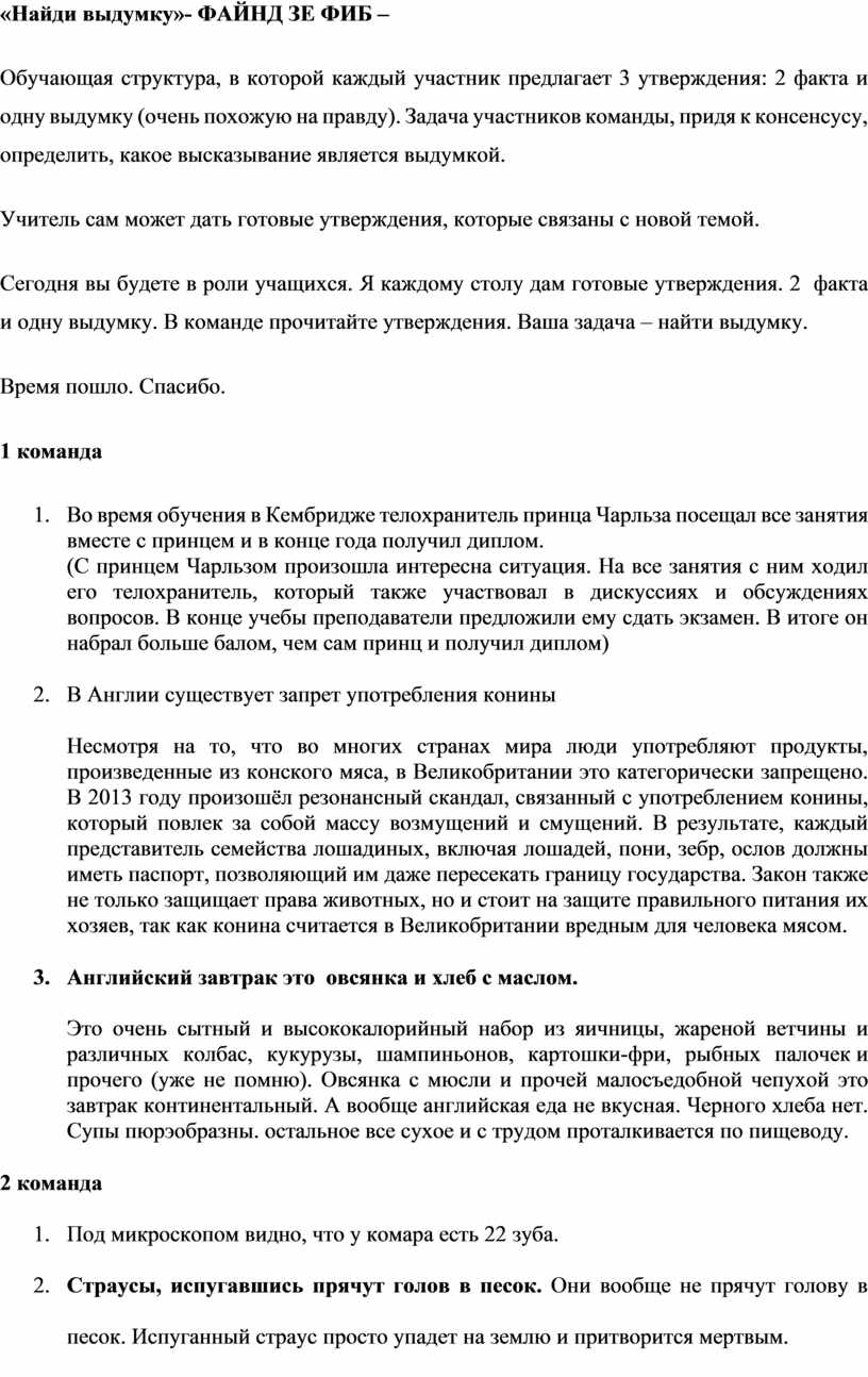 Сегодня вы будете в роли учащихся. Я каждому столу дам готовые утверждения. 2 факта и одну выдумку. В команде прочитайте утверждения. Ваша задача – найти выдумку.