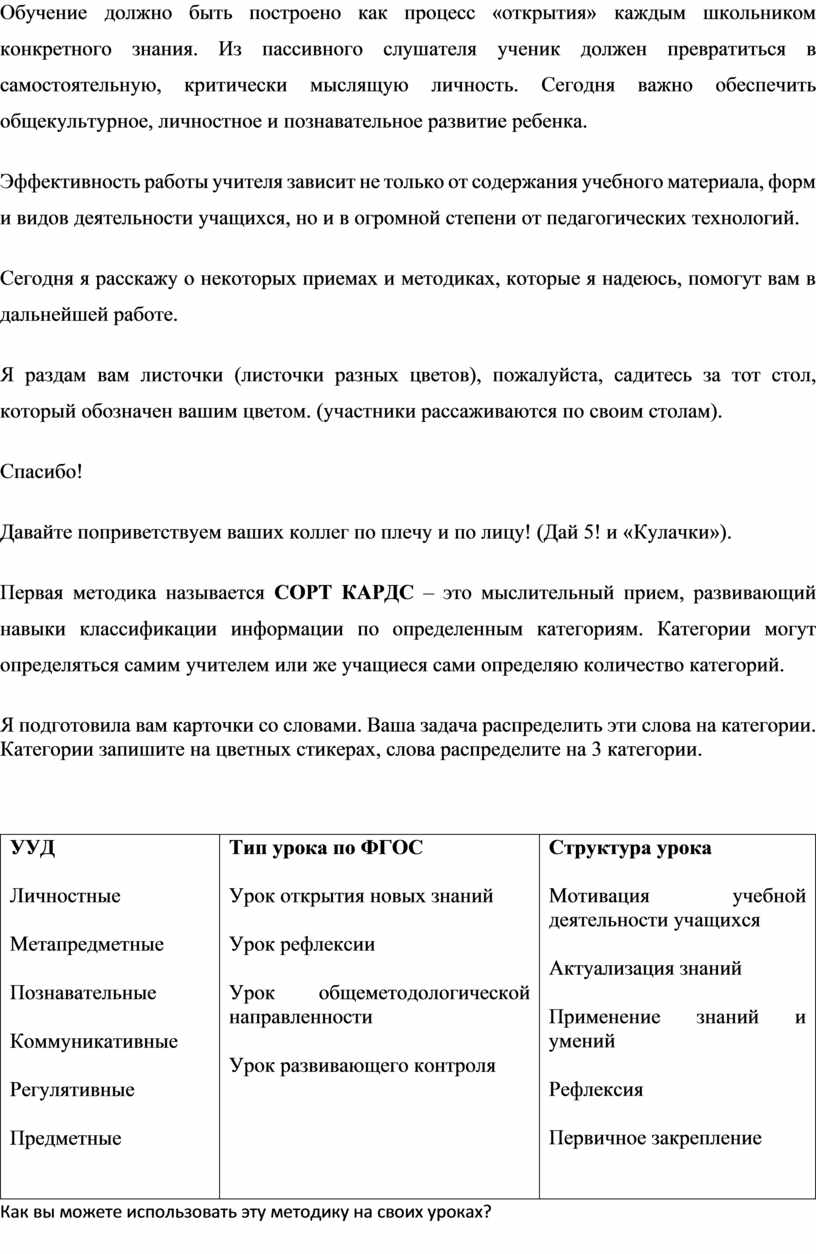Первая методика называется СОРТ КАРДС – это мыслительный прием, развивающий навыки классификации информации по определенным категориям. Категории могут определяться самим учителем или же учащиеся сами определяю количество категорий.