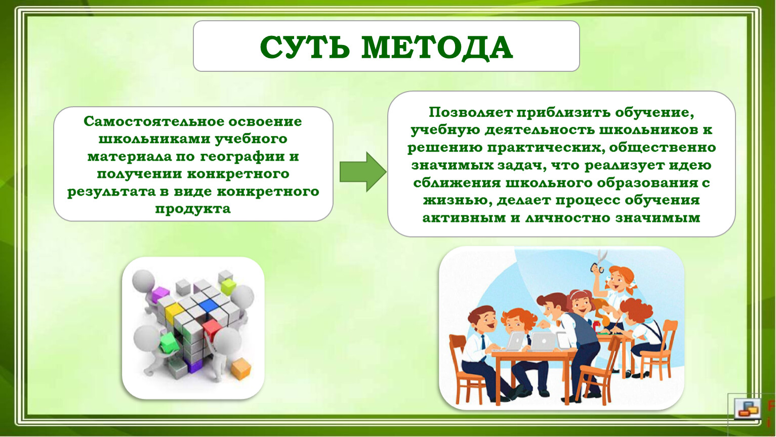 Самостоятельное освоение школьниками учебного материала по географии и получении конкретного результата в виде конкретного продукта