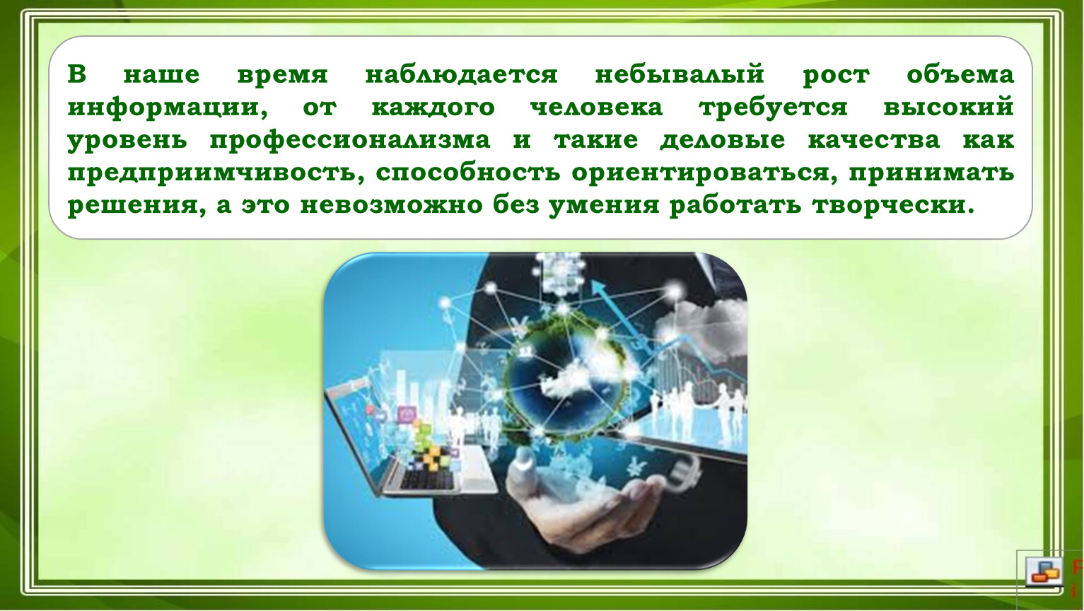 В наше время наблюдается небывалый рост объема информации, от каждого человека требуется высокий уровень профессионализма и такие деловые качества как предприимчивость, способность ориентироваться, принимать решения, а это невозможно без умения работать творчески.