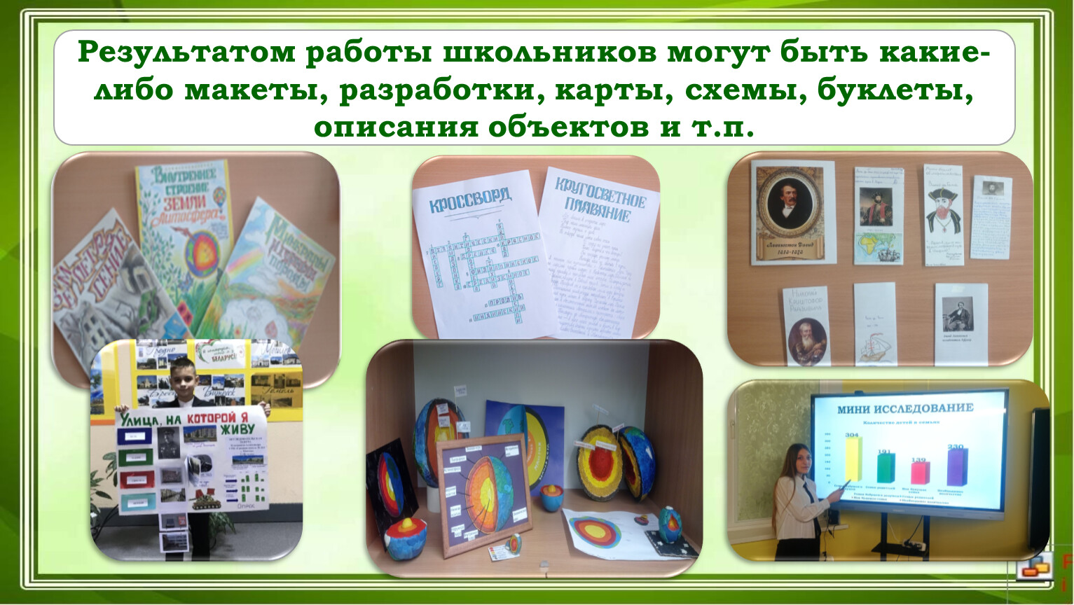 Результатом работы школьников могут быть какие-либо макеты, разработки, карты, схемы, буклеты, описания объектов и т.п.