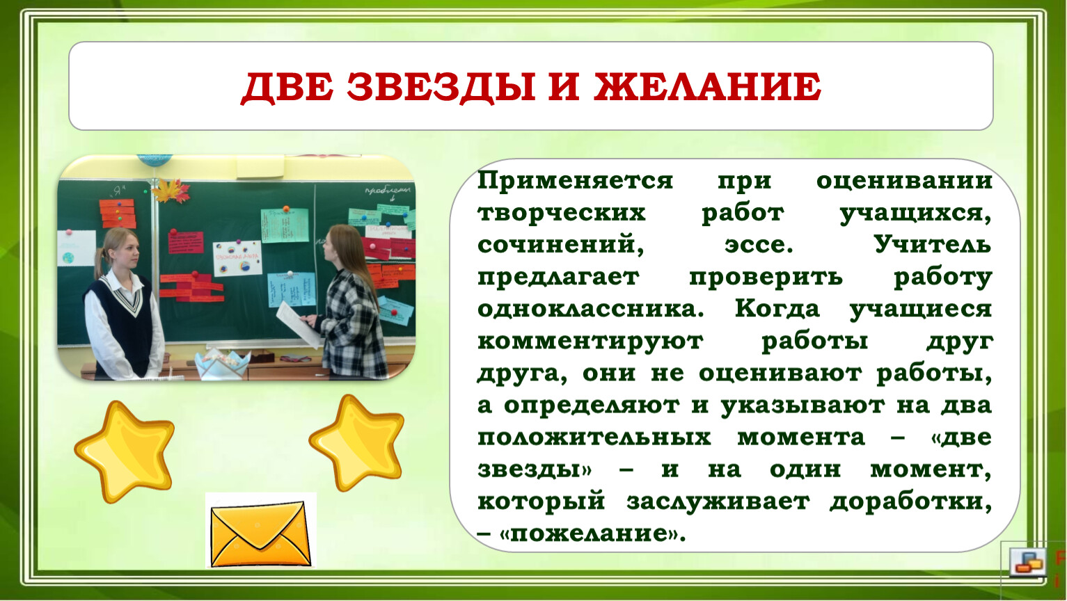 Применяется при оценивании творческих работ учащихся, сочинений, эссе. Учитель предлагает проверить работу одноклассника. Когда учащиеся комментируют работы друг друга, они не оценивают работы, а определяют и указывают на два положительных момента – «две звезды» – и на один момент, который заслуживает доработки, – «пожелание».