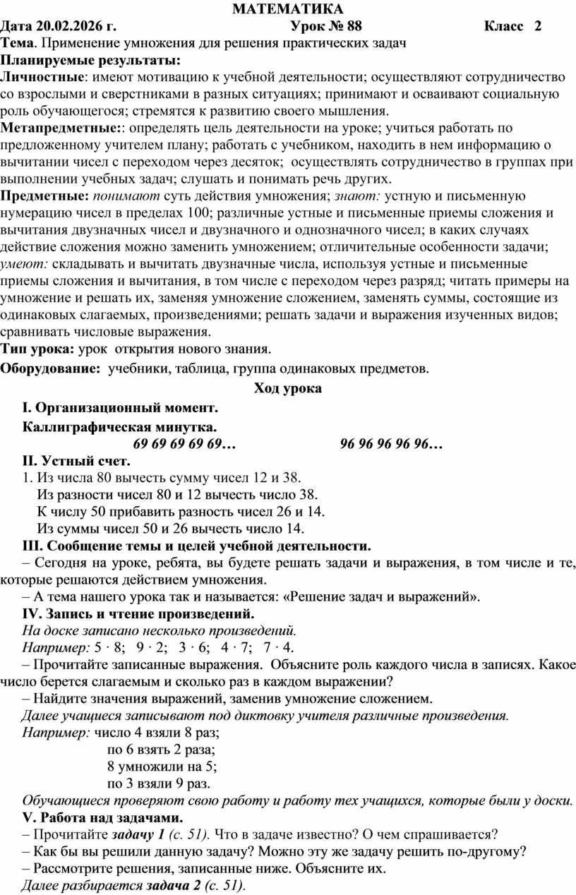Предметные: понимают суть действия умножения; знают: устную и письменную нумерацию чисел в пределах 100; различные устные и письменные приемы сложения и вычитания двузначных чисел и двузначного и однозначного чисел; в каких случаях действие сложения можно заменить умножением; отличительные особенности задачи; умеют: складывать и вычитать двузначные числа, используя устные и письменные приемы сложения и вычитания, в том числе с переходом через разряд; читать примеры на умножение и решать их, заменяя умножение сложением, заменять суммы, состоящие из одинаковых слагаемых, произведениями; решать задачи и выражения изученных видов; сравнивать числовые выражения.
