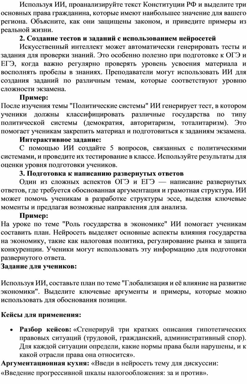 Правовые темы занимают значительное место в экзаменационных заданиях по обществознанию. На уроках учащиеся сталкиваются с необходимостью работать с законодательными актами, такими как Конституция РФ, Семейный кодекс, законы о труде и другие. Использование ИИ помогает упростить процесс анализа текстов и сделать его более продуктивным.