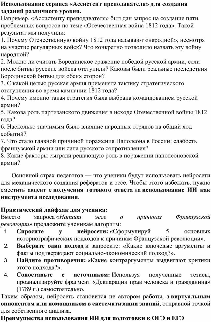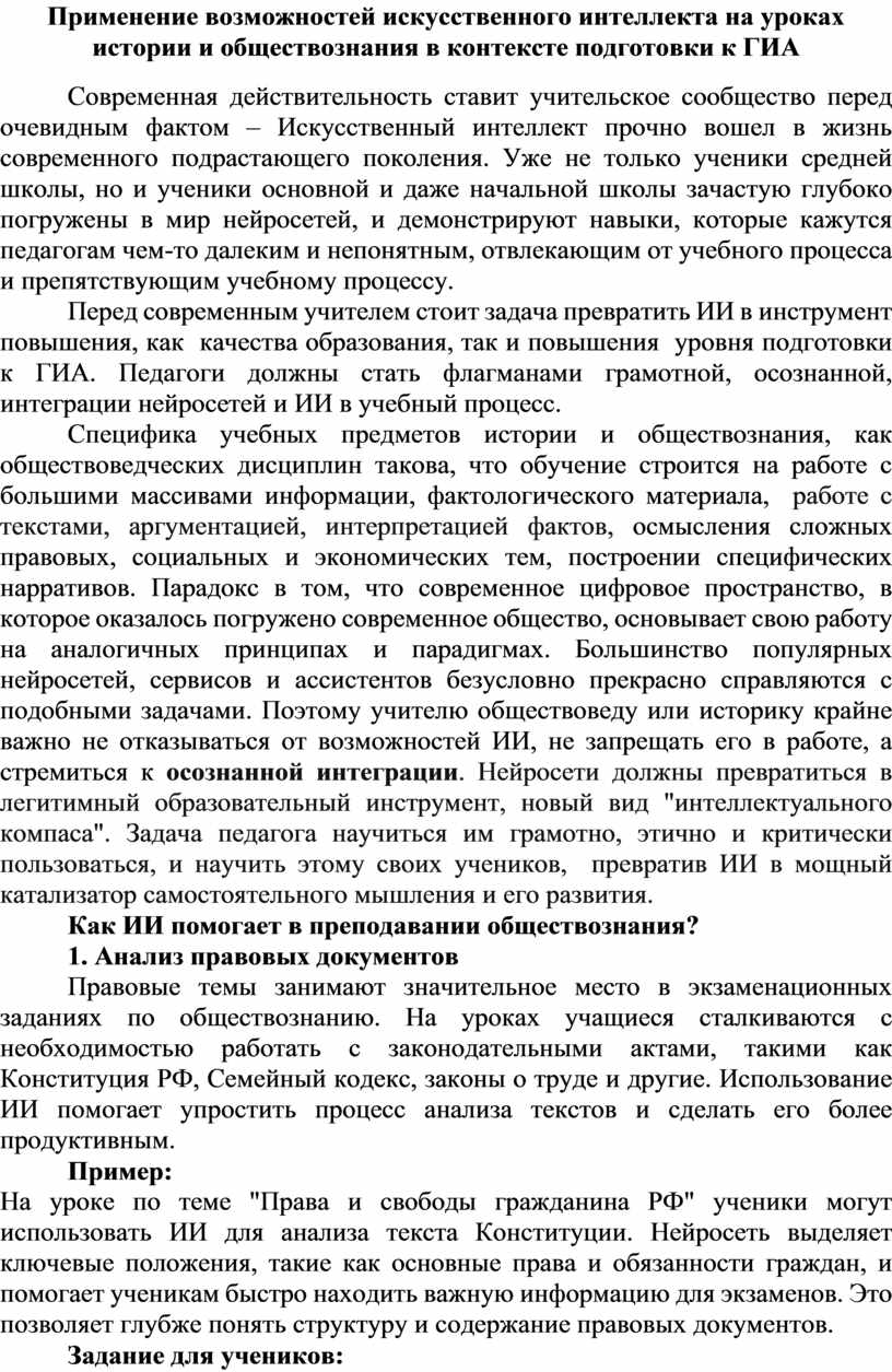 Применение возможностей искусственного интеллекта на уроках истории и обществознания в контексте подготовки к ГИА