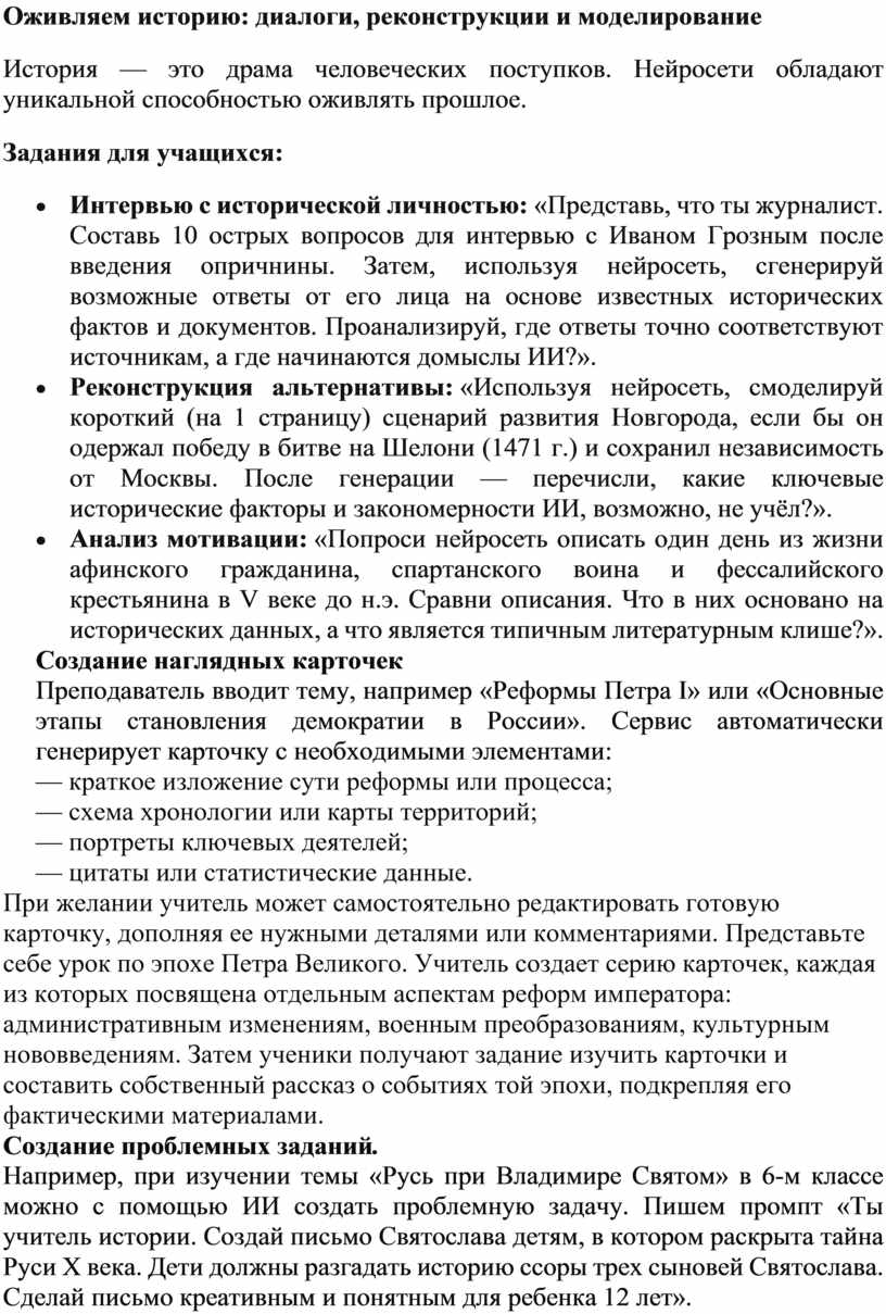 · Интервью с исторической личностью: «Представь, что ты журналист. Составь 10 острых вопросов для интервью с Иваном Грозным после введения опричнины. Затем, используя нейросеть, сгенерируй возможные ответы от его лица на основе известных исторических фактов и документов. Проанализируй, где ответы точно соответствуют источникам, а где начинаются домыслы ИИ?».