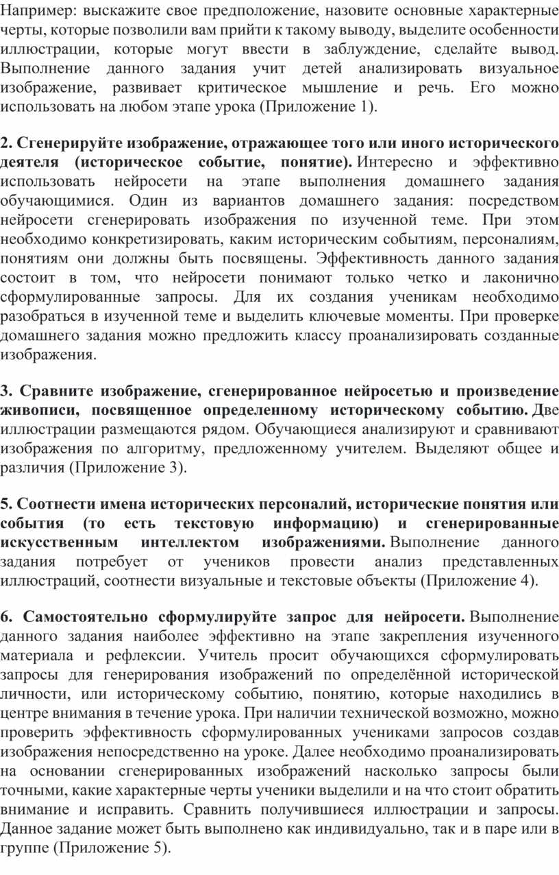 6. Самостоятельно сформулируйте запрос для нейросети. Выполнение данного задания наиболее эффективно на этапе закрепления изученного материала и рефлексии. Учитель просит обучающихся сформулировать запросы для генерирования изображений по определённой исторической личности, или историческому событию, понятию, которые находились в центре внимания в течение урока. При наличии технической возможно, можно проверить эффективность сформулированных учениками запросов создав изображения непосредственно на уроке. Далее необходимо проанализировать на основании сгенерированных изображений насколько запросы были точными, какие характерные черты ученики выделили и на что стоит обратить внимание и исправить. Сравнить получившиеся иллюстрации и запросы. Данное задание может быть выполнено как индивидуально, так и в паре или в группе (Приложение 5).