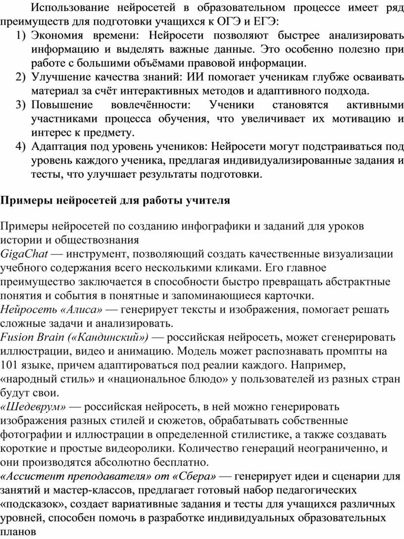 Использование нейросетей в образовательном процессе имеет ряд преимуществ для подготовки учащихся к ОГЭ и ЕГЭ: