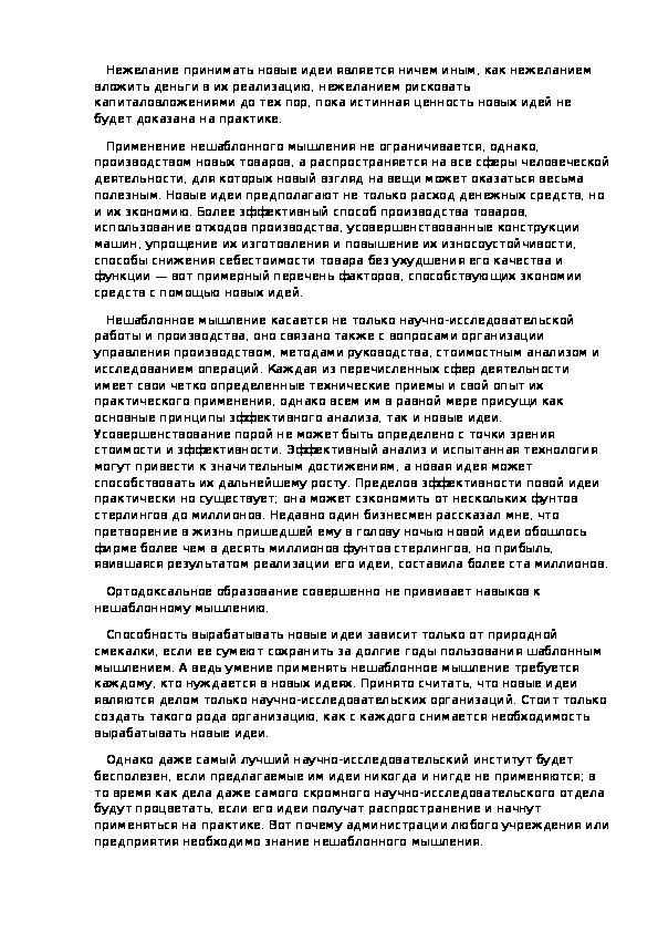ЦЕЛЬ нешаблонного мышления — выработка новых идей. Но кто по-настоящему заинтересован в новых идеях, кроме тех, кто их имеет? Действительно ли те, кто должен применять новые идеи, с нетерпением ждут этих идей? Небезызвестно, что заполучить новую идею гораздо легче, чем претворить ее в жизнь. Короче, все полны желания иметь новые идеи на словах, но не на деле.
