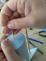 Из трубочки делается перемычка между мачтами. По середине пробивается отверстие шилом в которое вставляется зубочистка. |