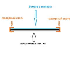 Закрепить эскиз на листе потолочной плитки из пенопласта малярным скотчем . |